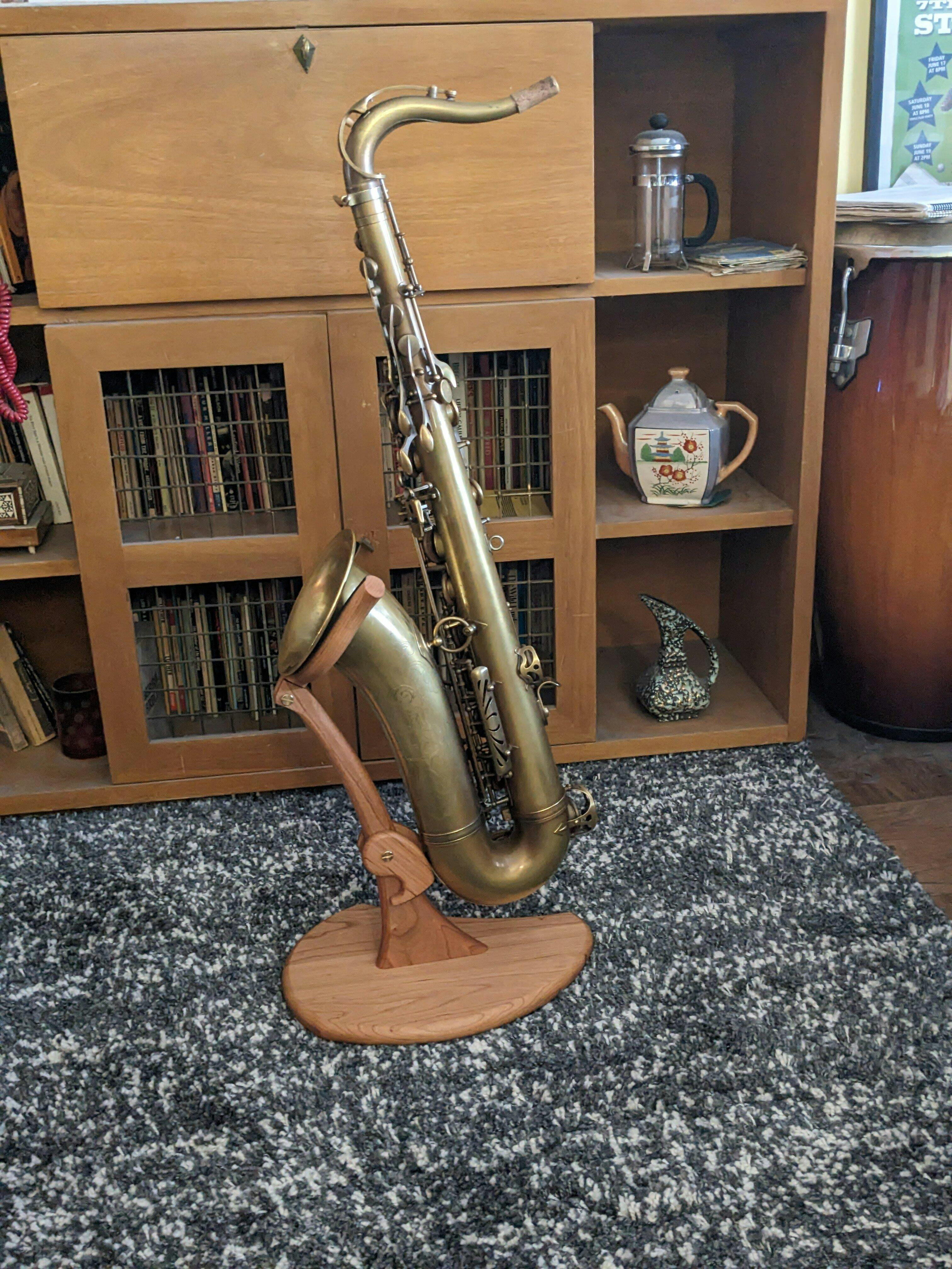 This is the stand that launched Wood & Winds as a brand. The floor stand for saxophone is made from solid hardwood, the only exceptions being the two solid brass connector bolts, and one steel bolt that secures the base to the rest of the stand.